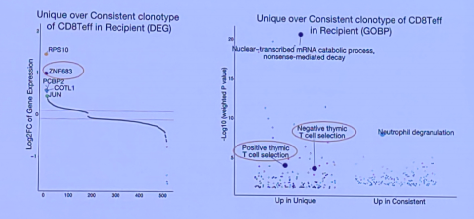 具体而言,在单倍体移植后,受者的T细胞受体(TCR)谱系与供者之间存在显著差异;而在HLA匹配同胞移植中,受者的TCR构成与供者高度一致。将供受者间相同的TCR克隆定义为共享的共有型克隆,而仅存在于受者中的TCR克隆定义为特有型克隆。研究发现,与HLA匹配同胞供体移植相比,单倍体移植后特有型克隆的比例较高,而且这些特有型克隆高表达转录因子ZNF683以及胸腺选择信号通路相关基因,提示单倍体移植后T细胞更多通过中枢重建。