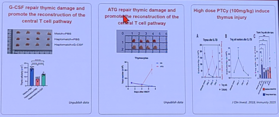 在黄晓军教授主导的“北京方案”中,G-CSF在促进单倍体移植成功中起着至关重要的作用。其团队未发布的数据表明,G-CSF能够改善胸腺微环境,促进中枢耐受性的建立。结合既往发表研究显示,G-CSF和ATG能够修复胸腺损伤并促进中枢T细胞通路重建。然而,高剂量的PT-Cy可诱导胸腺损伤,阻碍中枢T细胞通路重建。