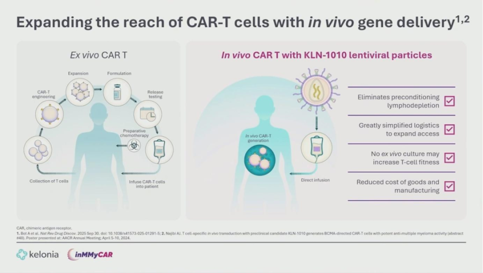 传统CAR-T疗法虽然有效,但受累于包括T细胞采集、体外工程改造和扩增在内的复杂制备工艺。此外,患者必须接受清淋化疗以促进CAR-T扩增,这会导致显著的毒性。KLN-1010通过静脉注射改良的慢病毒载体(LVV),将CAR转基因直接递送至患者体内,从而规避了这些障碍。