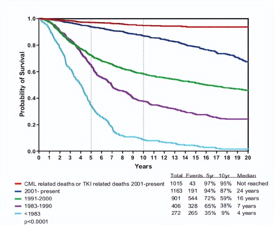 图1.1965年至今MD安德森癌症中心治疗的CML患者的Kaplan-Meier生存曲线