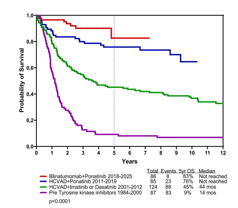Ph+ ALL在2000年前是成人ALL中预后最差的亚型,5年生存率不足10%。其治疗转折点有两个:一是2000年起在化疗中加入BCR::ABL1 TKI;二是2017年后用贝林妥欧单抗替代强化疗。MD安德森癌症中心的研究轨迹清晰展示了这一进步:从1984-2000年(前TKI时代)的5年总生存率9%,到2001-2012年(伊马替尼/达沙替尼+化疗)的45%,再到2011-2019年(普纳替尼+化疗)的76%,最终在2018-2025年(普纳替尼+贝林妥欧单抗的无化疗/低化疗方案)达到83%。