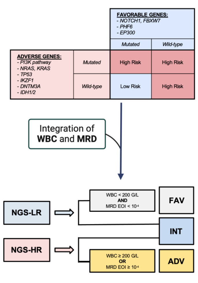 过去的研究报道了在无K-NRAS和PTEN基因突变的情况下,携带NOTCH1和/或FBXW7突变的成人和儿童T-ALL患者预后更佳。高通量下一代测序(NGS)技术的发展使我们能够优化T-ALL的预后预测。本研究对GRAALL-2003/2005方案的198例首次缓解(CR1)的成人T-ALL患者和来自FRALLE2000T的242例儿童T-ALL患者进行了72个T-ALL相关癌基因的靶向全外显子测序,并基于NGS构建首个T-ALL危险分层系统,将低危组患者分类为携带N/F、PHF6或EP300突变,且不含N-K-RAS、PI3K通路(PTEN、PIK3CA和PIK3R1)、TP53、DNMT3A、IDH1/2和IKZF1改变的患者,其5年复发累积发生率(CIR)估计为21%。其余患者被归类为高危组,其5年CIR估计为47%。本研究在儿童队列中验证了这一分层。无论是在成人还是儿童队列中,基于NGS的分类系统都具有良好的预后价值,且独立于微小残留病灶(MRD)和白细胞计数(WBC)。将基于NGS的分层系统纳入综合危险分层模型(包括诊断时的WBC计数和诱导治疗结束时的MRD),临床能够识别出一个不良预后亚组(25%),其5年CIR估计为51%,以及一个良好预后组(32%),其5年CIR估计为12%。基于NGS的分层结合WBC和MRD,能够更精确地划分T-ALL的预后分层,并识别出可能受益于创新治疗方法的患者。