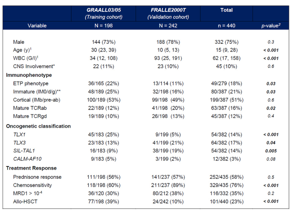 研究纳入了来自GRAALL-2003/2005治疗方案(ClinicalTrial.gov, NCT00222027, NCT00327678)的198名在诱导治疗后达到CR1且可获得诊断性DNA和/或cDNA的患者。并纳入了2000年至2010年间,根据FRALLE2000T指南,在法国治疗的405名中的242名CR1儿童患者作为验证队列。纳入的患者与整个队列在临床结果上无差异。