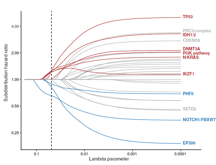本研究使用惩罚回归模型,在 Fine 和 Gray 模型中检验了 NGS 面板 72 个基因中超过 2% 的患者的 39 个基因突变对复发风险的影响。结果表明,N/F、PHF6和EP300改变与良好的预后相关。相反,N-K-RAS、PI3K通路、TP53、IDH1/2、IKZF1和DNMT3A突变与较高的复发风险显著相关。