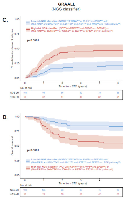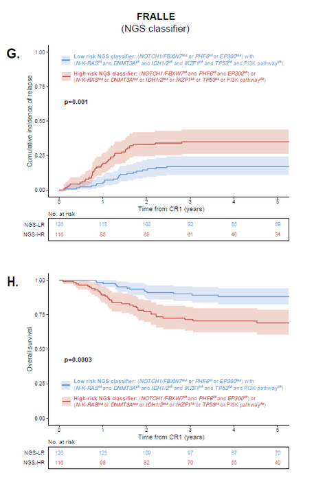 分析计划:首先在GRAALL队列中比较了先前公布的NOTCH1/FBXW7/RAS/PTEN分层系统(NFRP)在Sanger或NGS技术的结果。然后构建了一个新的NGS分层系统。最后,我们评估了新NGS分层系统的预后影响,同时考虑了常规预后变量:WBC和MRD1,分别使用先前公布的阈值≥200x109/L和≥10-4。并在儿童队列中进行验证。