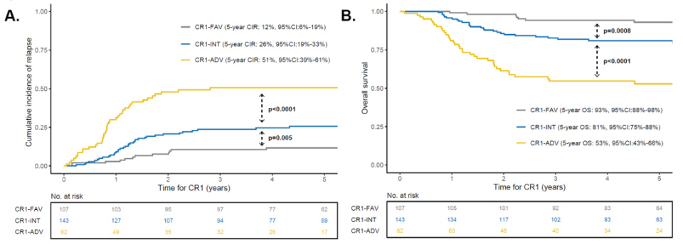 在5年随访中,CR1-FAV组患者的CIR为12%(95%CI:6%-19%),CR1-INT组患者的CIR为26%(95%CI:19%-33%)(与CR1-FAV组相比,SHR=2.34,95%CI:1.26-4.35,P=0.005),CR1-ADV组患者的CIR为51%(95%CI:39%-61%)(与CR1-INT组相比,SHR=2.49,95%CI:1.59-3.92,P<0.0001)。CR1-FAV组患者的5年OS为93%(95%CI:88%-98%),CR1-INT组患者的OS为81%(95%CI:75%-88%)(与CR1-FAV组相比,HR=3.63,95%CI:1.59-8.28,P=0.0008),CR1-ADV组患者的OS为53%(95%CI:43%-66%)(与CR1-INT组相比,HR=2.73,95%CI:1.68-4.43,P<0.0001)。