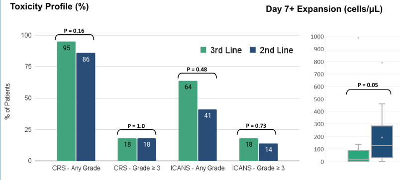 随着CAR-T疗法在临床越来越多的应用,发现很多影响其疗效的因素,其中之一就是治疗线数。2022欧洲血液学年会(EHA)上公布的一项真实世界数据显示,随着治疗线数增加,CAR-T治疗R/R DLBCL完全缓解(CR)率降低,生存变差。2023 ASH年会上公布的伊朗一项多中心回顾性倾向匹配评分分析,纳入2019年1月至2023年6月接受Axi-cel治疗的44例LBCL患者,其中二线治疗患者及三线治疗患者各22例,结果显示Axi-cel二线治疗较三线治疗具有更优的客观缓解率(ORR)和PFS,而不良事件(AE)发生率相似。二线治疗更高的CAR-T扩增提示早线治疗制备的CAR-T产品有更好的质量和更优的T细胞亚型。