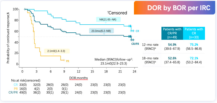 既往关键性ZUMA-1、JULIET、TRANSCEND NHL001临床试验分别证实Axi-cel、Tis-cel、Liso-cel可显著改善DLBCL患者总生存(OS)率和无进展(PFS)率。2023年美国血液学会(ASH)年会上最新公布的ZUMA-1研究6年随访结果进一步显示,Axi-cel治疗后59例最佳完全缓解(bCR)患者5年完全缓解持续时间(DOCR)率达56.7%,其中12个月和24个月持续CR患者5年DOCR率分别高达84.3%和91.3%,体现出治愈性。而2022年美国临床肿瘤学会(ASCO)年会上公布的针对Relma-cel的两年随访结果同样令人振奋,中位缓解持续时间(DOR)达20.3个月,2年DOR率达40.3%,其中商业化剂量组(100×106剂量组)中位DOR为23.3个月,2年DOR率高达56.18%。