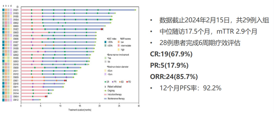 奥布替尼联合利妥昔单抗已被证明可以协同增效诱导的NK细胞介导的ADCC,促进肿瘤凋亡。奥布替尼联合来那度胺和利妥昔单抗(OLR)的治疗方案,作为一线治疗未经治疗的MCL患者,已在POLARIS研究中显示出显著的疗效和良好的耐受性。截至2024年2月15日的数据截止日期,29例患者中,96.6%完成了6个周期的诱导治疗,其中67.9%达到了完全缓解(CR),总缓解率(ORR)为85.8%。此外,通过二代测序(NGS)检测外周血循环肿瘤DNA(ctDNA),以评估肿瘤的深度缓解情况,能够有助于预测预后。ctDNA的水平越低,表明肿瘤残留越少,提示患者可能有更好的预后和治愈的潜在可能性。在25例MRD分析中,外周血MRD(PB-MRD)和骨髓MRD (BM-MRD)均为阴性。在安全性方面,28例患者中96.6%发生了不良事件,主要为血液学毒性,但无死亡报告。这些数据表明,奥布替尼联合方案不仅在提高缓解率方面展现出潜力,同时保持了治疗的安全性。