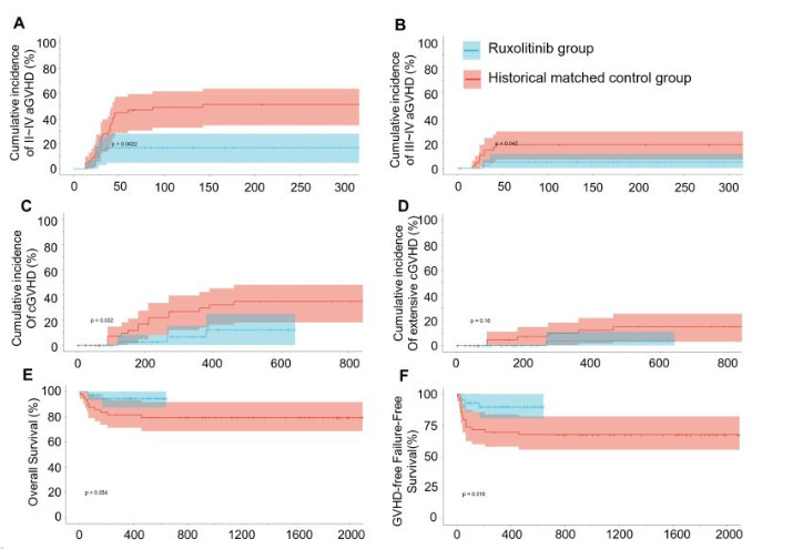 在目前的单纯外周造血干细胞移植中,急性GVHD的发生率仍然较高。无论是在抗胸腺细胞球蛋白(ATG)体系还是后置环磷酰胺(PTCy)体系中,移植后急性GVHD的发生率均可达40%左右。基于这一现状,我们自2021年起便启动了芦可替尼在GVHD预防中的临床探索。如姜主任所述,去年我们在EBMT大会上分享了相关回顾性研究结果。