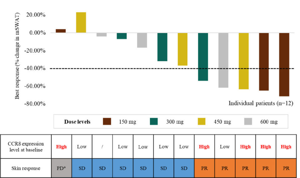 CCR8+生物标志物探索:基线CCR8高表达组(≥10%)的5例患者中,有4例(80%)皮肤疗效评估达到PR,而低表达的患者中,亦有1例获得皮肤PR,提示CCR8高表达可能为疗效预测标志物。