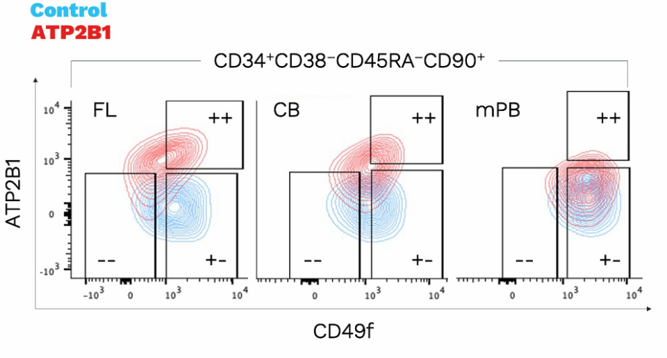 人类造血干细胞中ATP2B1+/–和CD49f+/–细胞的代表性流式细胞术图谱,分别来自胎肝(FL)、新生儿脐血(CB)和动员外周血(mPB)