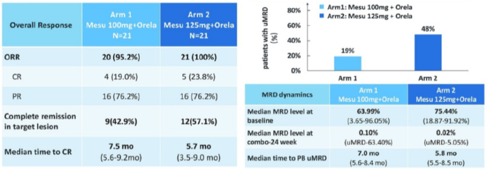 全部患者ORR为97.6%(100 mg组:95.2%;125 mg组:100%)。靶病灶完全缓解率为100 mg组33.3%(7/21),125 mg组为53.4%(11/21),骨髓检查正在进行中以确认完全缓解。两组中位缓解时间为1.9个月(范围:1.6–5.7个月)。第12周PB uMRD率:100 mg组为7.1%(1/14),125 mg组为46.2%(6/13);100 mg组中位MRD水平由基线的63.99%降至第12周的0.65%,125 mg组则从75.44%降至0.01%。两组均未观察到疾病进展。