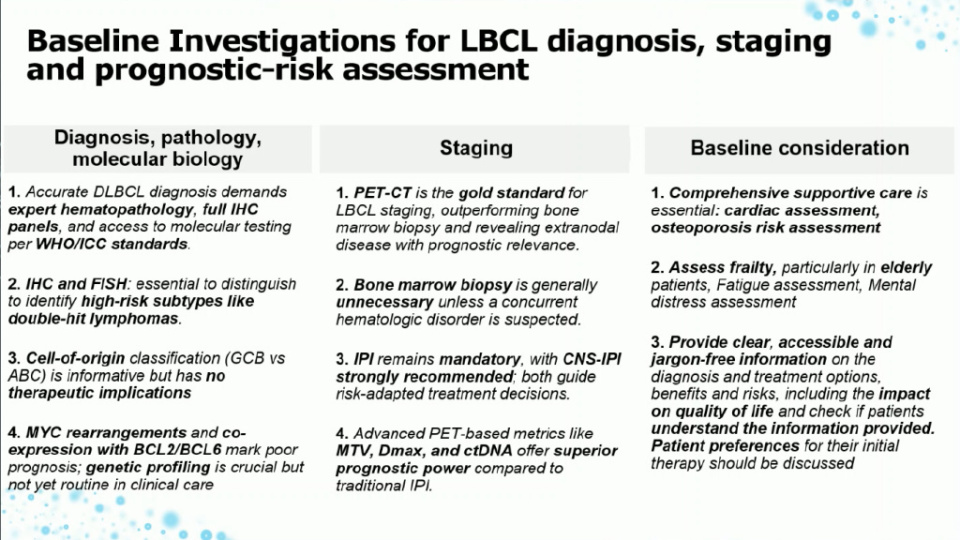 新版EHA指南首先强调了精准诊断和全面风险评估在LBCL管理中的核心地位。Thieblemont教授指出:“我们的共识是,所有诊断必须基于经验丰富的血液病理学专家,并采用全面的免疫组化(Immunohistochemistry, IHC)和分子检测标准。”指南推荐,IHC应至少包含CD20、BCL6、CD10、MUM1、MYC、BCL2、Ki-67和CD5等标记物,以准确界定LBCL亚型。