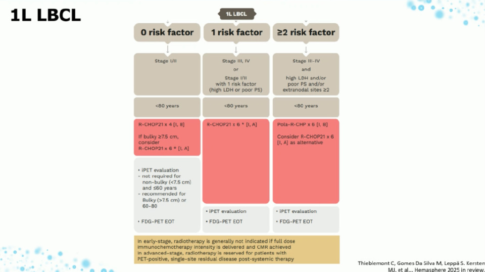 对于低风险患者(I/II期,0个风险因素),指南推荐采用4个周期的R-CHOP-21方案。Thieblemont教授解释说:“对于这类患者,我们的目标是实现治愈的同时最大限度地减少治疗毒性。若肿瘤巨大(直径>7.5厘米),可考虑增至6个周期。重要的是,若患者在足量化疗后达到完全代谢缓解,则通常无需进行巩固性放疗。”