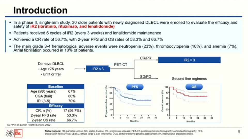 鉴于IR2和ZR2单臂试验的积极结果,PEARL研究作为一项多中心、随机、开放标签、对照非劣效性研究应运而生。该研究将老年、经综合老年评估(CGI)定义为unfit或虚弱状态的DLBCL患者按1:1的比例随机分为ZR2组和R-mini-CHOP组。主要终点是PFS,次要终点包括CR率、OS、安全性及生活质量。