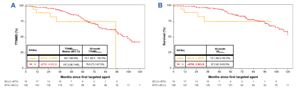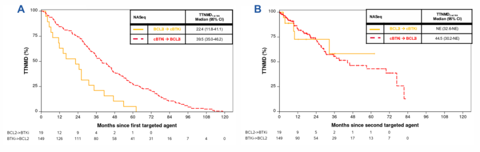 对于接受cBTKi→BCL2i治疗的患者,cBTKi的中位TTNMD为39.5个月,BCL2i的中位TTNMD为44.5个月。对于接受BCL2i→cBTKi治疗的患者,cBTKi的中位TTNMD为22.4个月,BCL2i的中位TTNMD未到达。