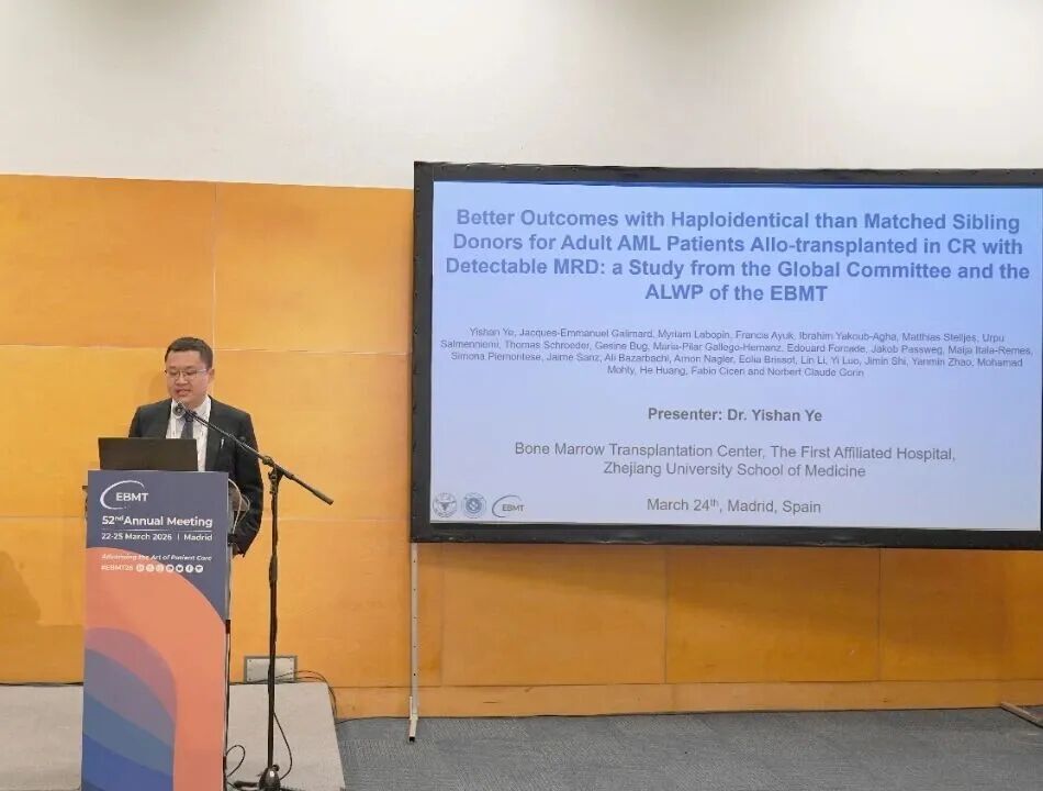 2026年3月22日-25日,第52届欧洲血液与骨髓移植学会(EBMT)年会于西班牙马德里正式召开。作为该领域最具影响力的学术会议,本届年会汇集了全球数千名专家学者,共同探讨移植与细胞治疗的最新进展。会议期间,浙江大学医学院附属第一医院叶逸山博士分享了题为“在微小残留病阳性完全缓解期移植的AML患者中,单倍体供者疗效优于全合同胞供者:一项EBMT全球委员会与ALWP的研究报告”的口头报告,为移植前供者选择策略提供了重要循证依据。《血液时讯》特邀叶逸山博士接受采访,深入解读该研究的核心发现及其对临床实践与未来研究方向的启示。