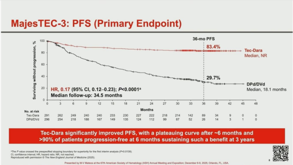 在2025年美国血液学会(ASH)年会的最新突破性摘要(LBA)专场,María-Victoria Mateos博士代表研究团队公布了备受期待的MAJEStec-3研究结果。该研究是首个公布的BCMA靶向双特异性抗体Ⅲ期临床试验,对比了Teclistamab联合Daratumumab(“Tech-Dara方案”)与标准治疗方案(Dara-Pd或Dara-Vd)治疗复发/难治性多发性骨髓瘤(RRMM)的疗效,取得了历史性的成果。Tec-Dara方案的无进展生存期(PFS)的风险比(HR)仅为0.17。这是目前BCMA靶向治疗领域报告的最显著疗效信号,标志着其有望为早期复发患者带来“功能性治愈”。