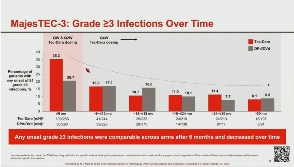 研究显示Tech-Dara方案具有显著的总生存(OS)获益(3年OS率:83.3% vs 65%;HR=0.46),但安全性分析提示,治疗早期的感染管控至关重要。