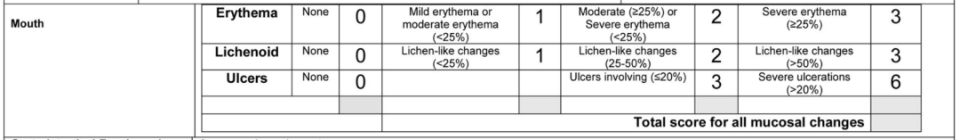 [4]Schubert MM, Williams BE, Lloid ME, et al. Clinical assessment scale for the rating of oral mucosal changes associated with bone marrow transplantation. Development of an oral mucositis index. Cancer. 1992 May 15;69(10):2469-77. doi: 10.1002/1097-0142(19920515)69:10<2469::aid-cncr2820691015>3.0.co;2-w.