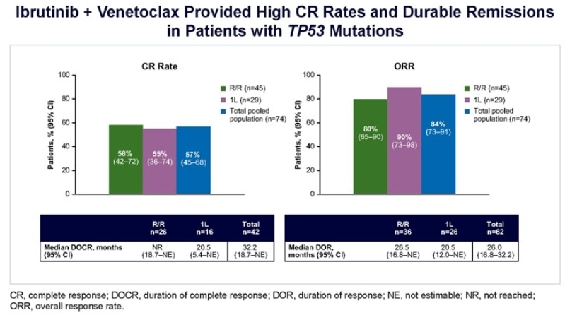 2024 ASCO大会上公布的SYMPATICO研究[8],旨在3个MCL患者队列中评估伊布替尼(Ibr)+维奈克拉(Ven)的疗效。本次公布了IV治疗TP53突变患者的疗效,结果显示,TP53突变MCL患者接受IV治疗获得深度且持续缓解,一线治疗ORR为90%,CR率为55%,缓解持续时间(DOR)为20.5个月。