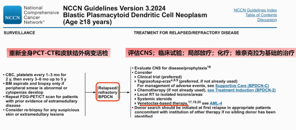 在BPDCN治疗领域中,靶向治疗已成为进展的重要部分,其中针对CD123、TCF-4以及BCL-2等关键靶点的治疗策略均取得了重要进展。在NCCN指南(2024版)中,对于新诊断的BPDCN,推荐的治疗方案包括Tagraxofusp和髓系化疗方案等(图4),并建议在CR1时进行allo-HSCT。对于难治复发的患者,指南强调重新进行全身PCT-CT和皮肤结外病变活检,并仔细评估CNS(图5、图6)。