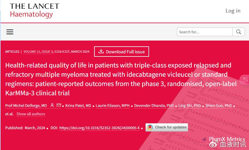 编者按:KarMMa-3试验是一项Ⅲ期随机对照临床试验,既往中期分析结果显示,与标准治疗相比,Idecabtagene vicleucel(ide-cel)在既往接受过2~4种治疗的复发/难治性多发性骨髓瘤(RRMM)患者中,可显著延长无进展生存期(PFS)。近日,KarMMa-3试验的患者报告结局(PROs)发表于《柳叶刀-血液病学》(The Lancet Haematology),《肿瘤瞭望-血液时讯》整理如下,以飨读者。