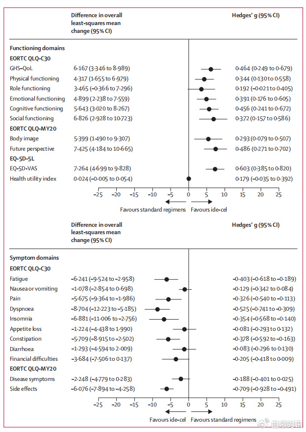 2019年5月6日至2022年4月8日期间,患者被随机分配。中位年龄为63岁;151名(39%)患者为女性;250名(65%)患者为白人,36名(9%)黑人或非裔美国人,19名(5%)西班牙裔或拉丁裔,12名(3%)亚裔,7名(2%)其他种族。中位随访时间为18.6个月。PRO评估的依从性始终高于75%。多数领域的Hedges' g效应量从0.3到0.7,与基线相比,总体最小二乘均值变化有利于ide-cel组。除QLQ-MY20 疾病症状、治疗副作用和EQ-5D-5L指数评分外,ide-cel组患者在主要关注的PRO领域显示有统计学意义和临床意义的改善,它们在评估随访期间显示出改善,但没有超过组内最小重要差异阈值。在QLQ-C30领域除角色功能、腹泻和经济困难外,在QLQ-MY20领域除身体形象外以及EQ-5D-VAS领域,ide-cel组比标准方案组获得有临床意义的改善所需的时间更短。