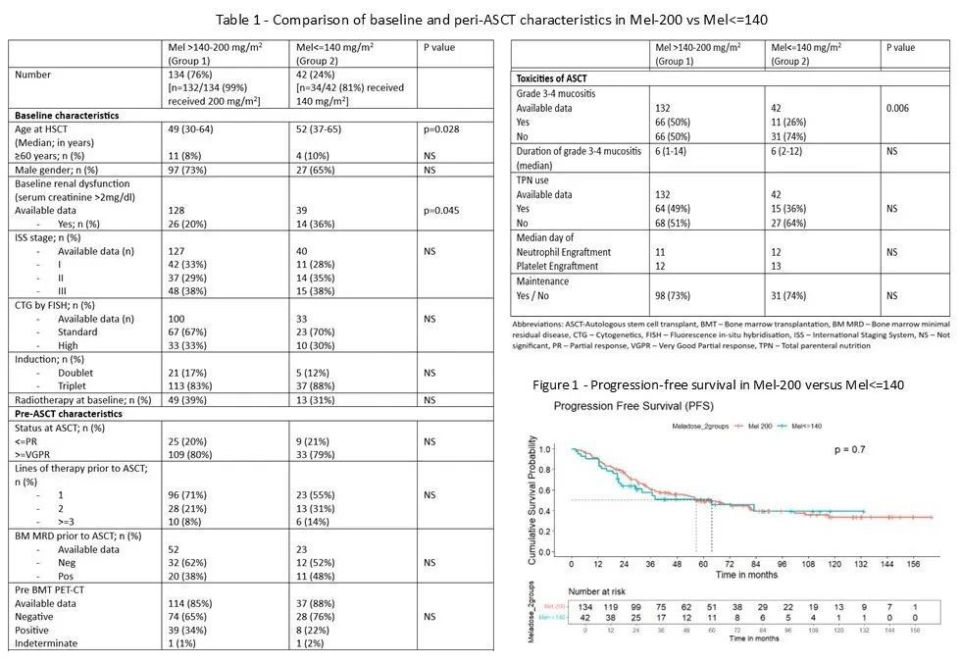 背景:200 mg/m²剂量的美法仑是多发性骨髓瘤预处理的标准剂量,但对于存在潜在毒性风险的患者通常使用140 mg/m²剂量的美法仑。目前关于美法仑200 mg/m²标准剂量与140 mg/m²剂量比较的数据较为匮乏。鉴于此,本研究试图比较美法仑>140-200 mg/m²(Mel-200组)与≤140 mg/m²(Mel≤140组)患者的中位无进展生存期(PFS)和总生存期(OS)。次要目标包括根据自体造血干细胞移植(ASCT)前≥非常好的部分缓解(≥VGPR)、首次缓解期移植、标准风险与高危细胞遗传学、骨髓(BM)流式细胞术微小残留病(MRD)以及ASCT前PET-CT状态进行生存分析。