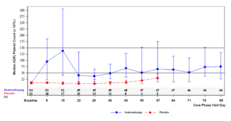 初步分析包括所有随机受试者;安全性分析包括所有接受≥1剂量研究药物的受试者。主要终点是持久的血小板反应,定义为在核心期的最后8周中,≥6周没有抢救治疗时可维持PC≥50×109/L。次要终点是在12周的核心阶段,没有抢救治疗的情况下,连续≥2次PC ≥50×109/L。其他次要终点包括第8天的血小板反应和抢救治疗的使用。