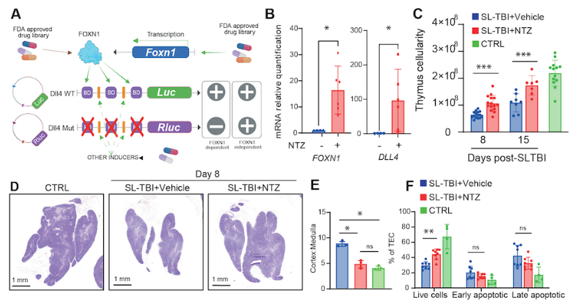 意大利罗马的Shirley Genah带来了“胸腺再生新策略:通过药物诱导Foxn1加速免疫重建”(OS05-08)。 该研究致力于寻找能够促进胸腺再生、改善T细胞重建的新方法。研究者通过对1530种FDA已批准药物进行高通量筛选,发现蛋白酶体抑制可通过诱导内质网应激和未折叠蛋白反应,进而上调胸腺上皮细胞关键转录因子Foxn1的表达。其中,抗寄生虫药物硝唑尼特(NTZ)能有效诱导Foxn1及其下游靶基因表达,且在体外无细胞毒性。在亚致死剂量全身照射的小鼠模型中,NTZ治疗能显著加速胸腺恢复,重建所有胸腺细胞亚群、成熟T细胞及胸腺上皮细胞结构,且不影响T细胞的正向与负向选择过程。这为因移植、放化疗或衰老导致胸腺功能不全的患者,提供了一种极具转化潜力的胸腺再生治疗新策略。