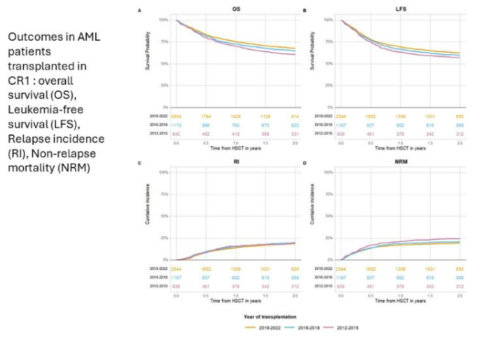 EBMT急性白血病工作组的Eolia Brissot分析了“急性髓系白血病单倍体移植的十年变迁:实践模式与结局”(OS03-05)。这项涵盖2012-2022年6818例患者的大型研究,清晰描绘了十年来AML单倍体移植的演变趋势:临床实践发生了显著变化——患者年龄更大、更多使用减低强度预处理、更多患者在首次缓解期移植、外周血干细胞成为绝对主导的移植物来源,并且以移植后环磷酰胺为基础的GVHD预防方案使用率大幅增加。
