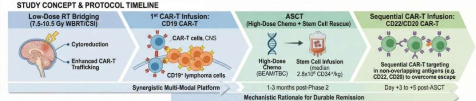 我们假设,克服这种治疗耐药需要多模式协同的治疗策略。本研究评估了一种新的综合治疗方案——CAST策略,即整合CAR-T细胞治疗、自体造血干细胞移植(ASCT)及序贯CAR-T细胞治疗,并通过低剂量分次放疗进行桥接治疗。