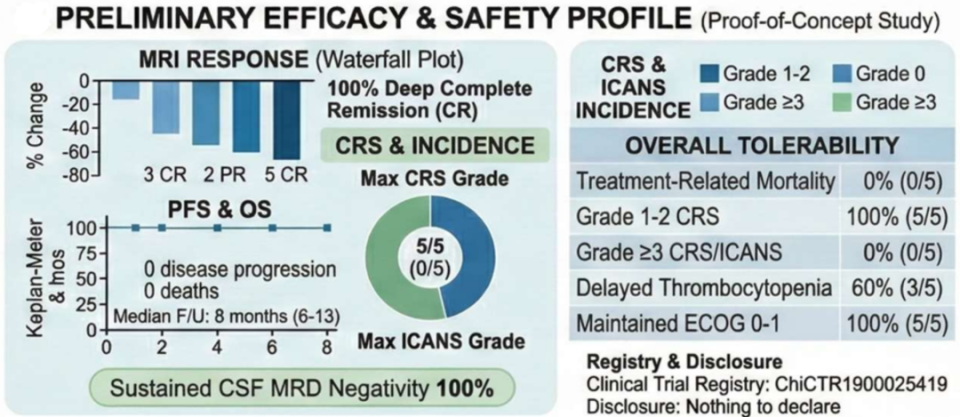 研究终点包括总体缓解率(PET或MRI评估)、脑脊液微小残留病(CSF MRD,流式细胞术检测)、安全性(CRS及ICANS)及生存结局。