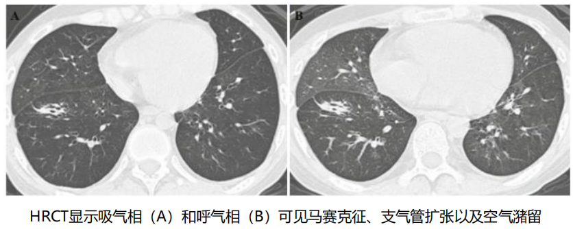 闭塞性细支气管炎综合征(BOS)作为常见的肺部cGVHD表现2,在allo-HSCT受者中发生率为3%~10%,在cGVHD患者中发病率约为14%,其病理特征为小气道管腔进行性不可逆的狭窄或闭塞,影像学上常见气体潴留、支气管扩张和支气管壁增厚3-4。早期风险因素包括使用外周血干细胞(PBSC)、移植后100天内发生下呼吸道感染以及第1秒用力呼气量(FEV1)下降10%5。