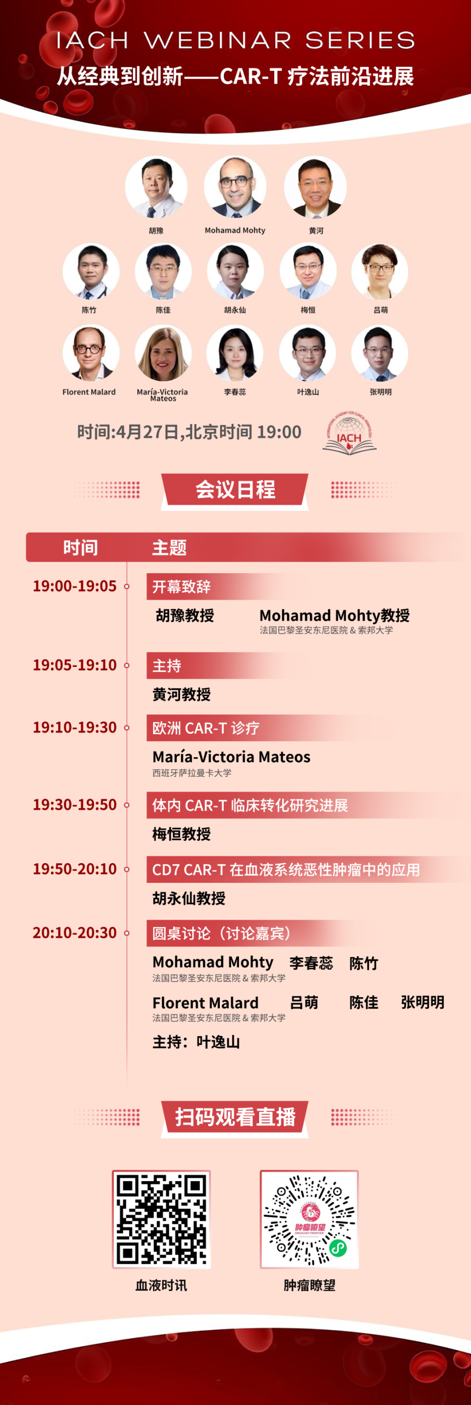首场会议以“从经典到创新——CAR-T 疗法前沿进展”为主题,将于4月27日19:00(中欧时间13:00)同步海内外线上开播。