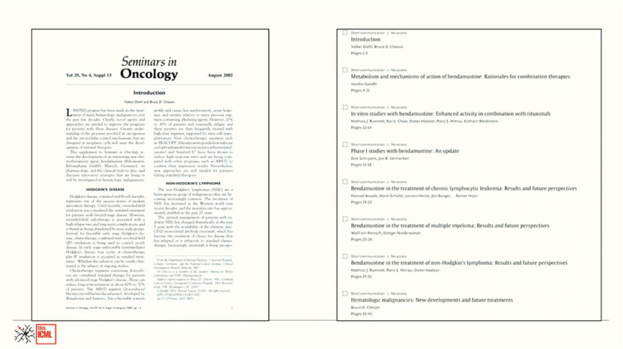 然而,在25年前,一次德国柏林癌症大会之行成为了其职业生涯的转折点。他结识了Angelika Pieper博士,并首次接触到了一种名为苯达莫司汀(bendamustine)的药物。尽管当时该药仅有德语文献且疗效“好得令人难以置信”,但Cheson教授与Volker Diehl教授深入研讨后,认为其数据充满潜力。通过促成苯达莫司汀与一家美国公司的合作,Cheson教授团队在美国开展了首批三项临床试验,包括单药治疗以及与利妥昔单抗(rituximab)的联合用药。结果显示,该药在利妥昔单抗难治性惰性淋巴瘤患者中表现出与德国数据相似的疗效,近四分之三的患者获得缓解,其中四分之一达到完全缓解,最终促成了苯达莫司汀的FDA批准。